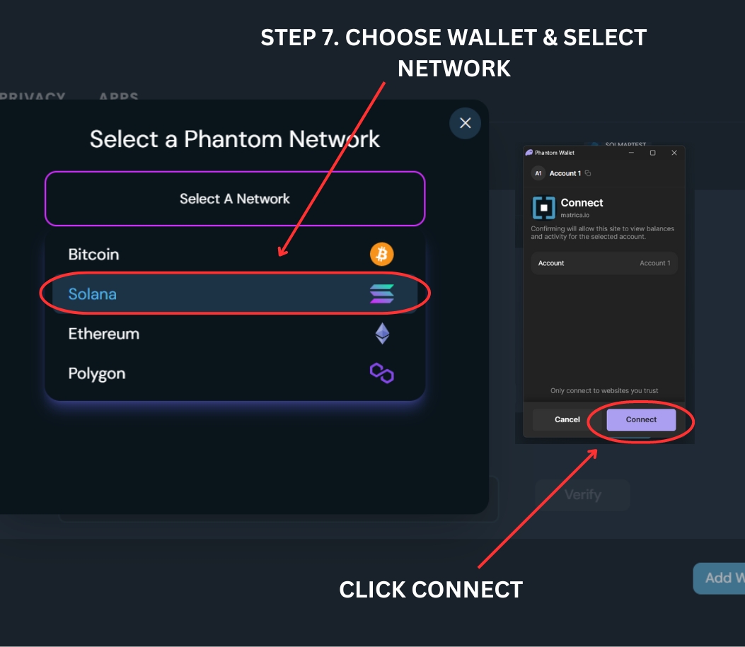 Step 7. Choose your wallet & select Solana as the network. Click "connect" when the wallet connect prompt appears.